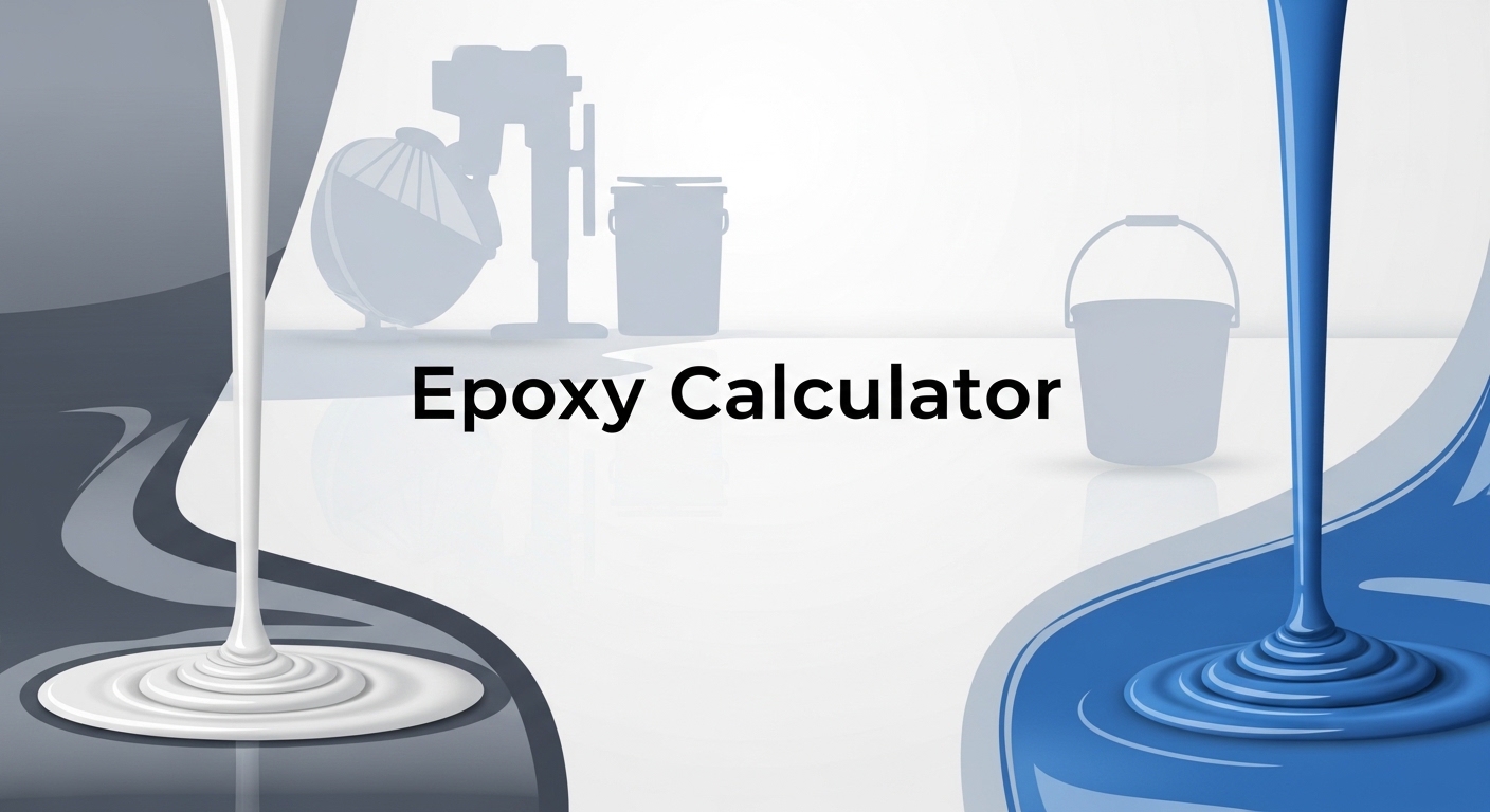 The Epoxy Calculator takes surface area, thickness, and coverage rate. It calculates required volume, adjusts for waste, and splits the amount into resin and hardener parts.