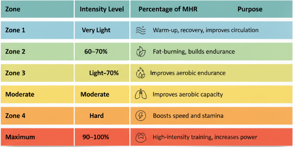 Heart rate zones show how hard your body is working during exercise. Each zone targets different benefits, from improving cardiovascular health to burning fat and increasing stamina.